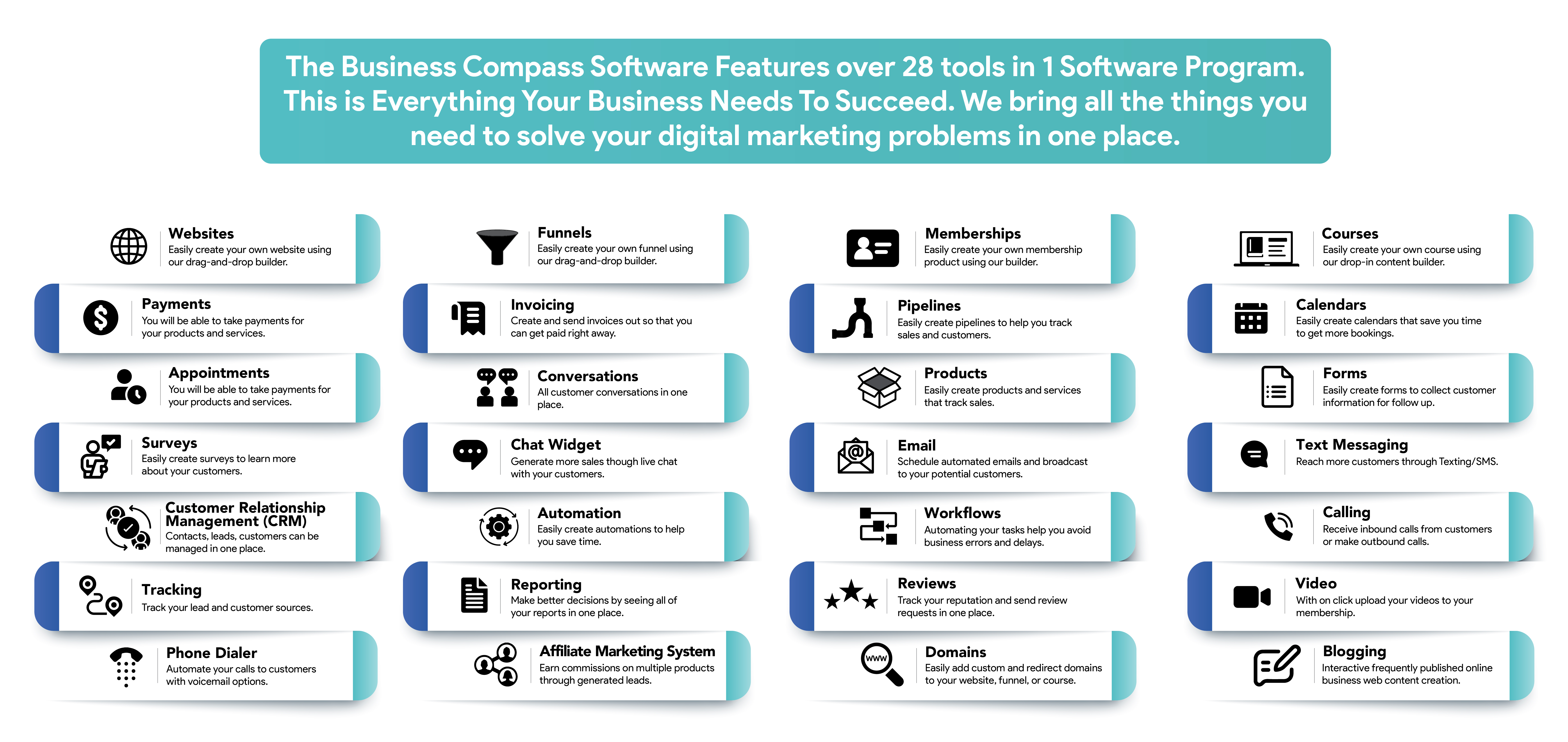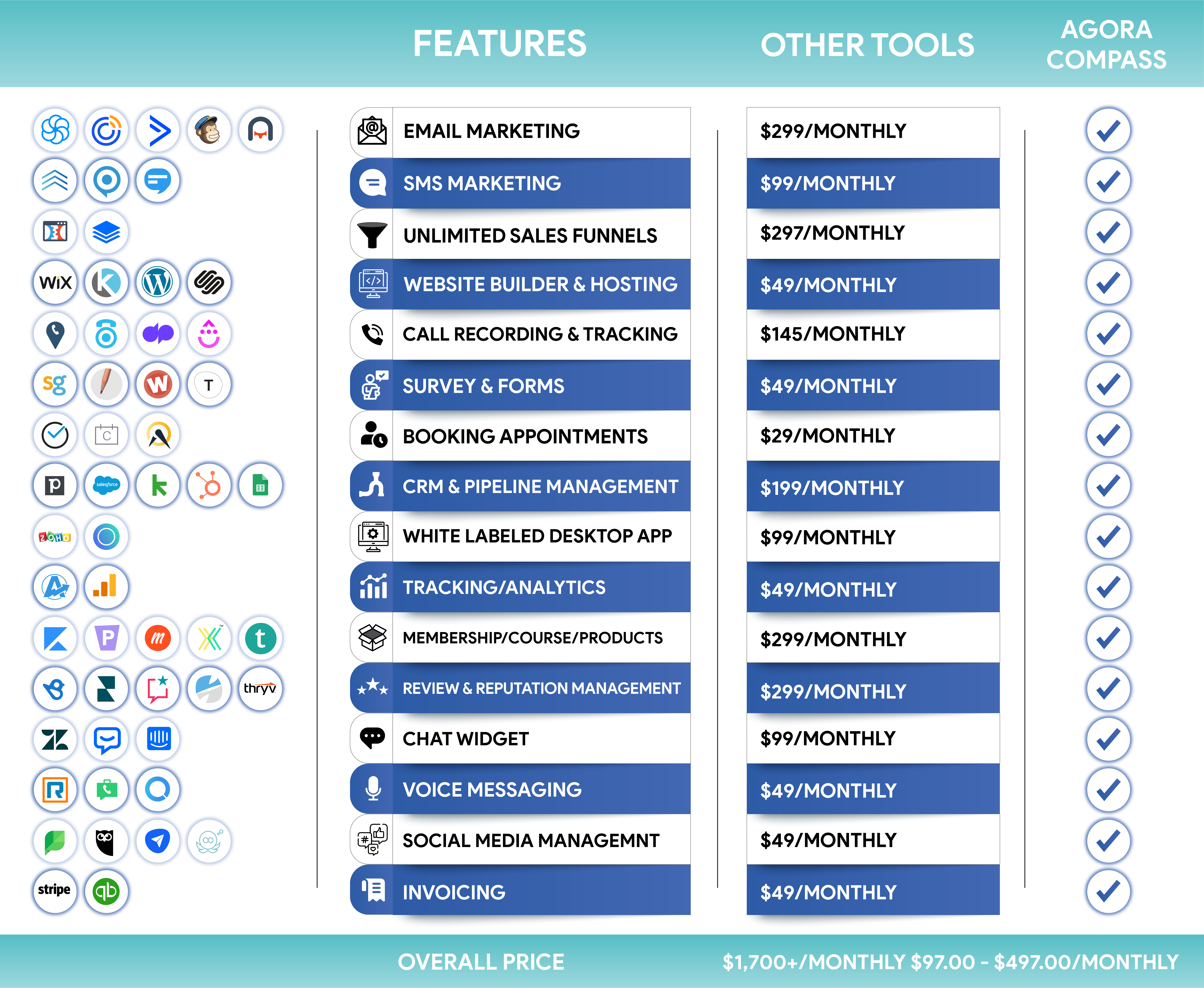 We Give you Everything you need to grow and manage your business. Don't Spend Hundreds of Dollars On Marketing Software when the Agora Business Compass Completely Replaces 28+ software that would normally cost you $1,750+ monthly.